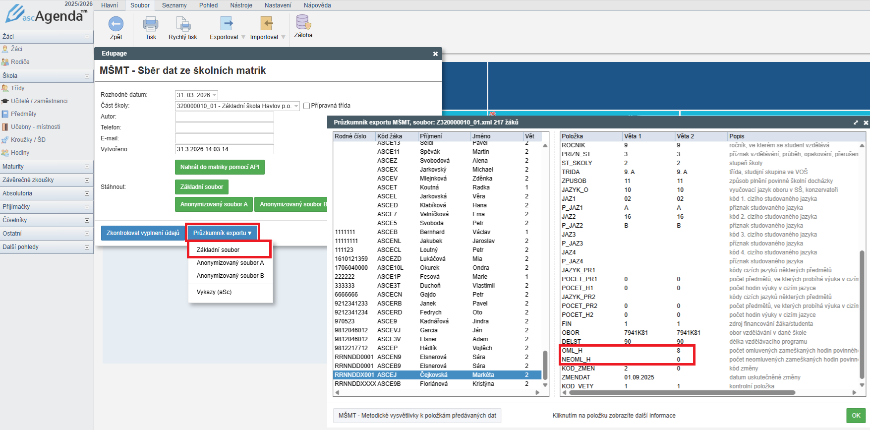 Počet omluvených a neomluvených hodin se při sběru dat do MŠMT exportuje z vysvědčení automaticky.