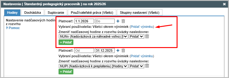 2. Do nového políčka zapíšeme dátum začiatku platnosti "od" 01.01.2026. Môžeme pridať aj výnimku pre zamestnancov, ktorí môžu mať iné podmienky v zmluve. p. Hazucha má naďalej hodiny preplácané. Klikneme na modré "Pridať výnimku":