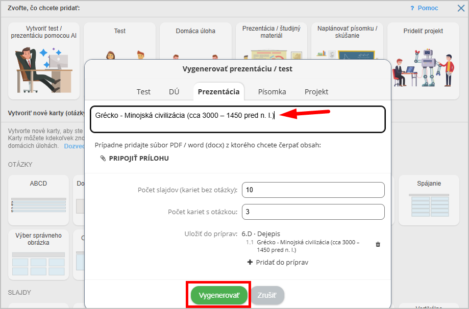 Zvoľte počet slajdov a či má mať prezentácia aj kontrolné otázky. Ak ak áno, zadajte počet. Potom stlačte tlačidlo Vygenerovať.