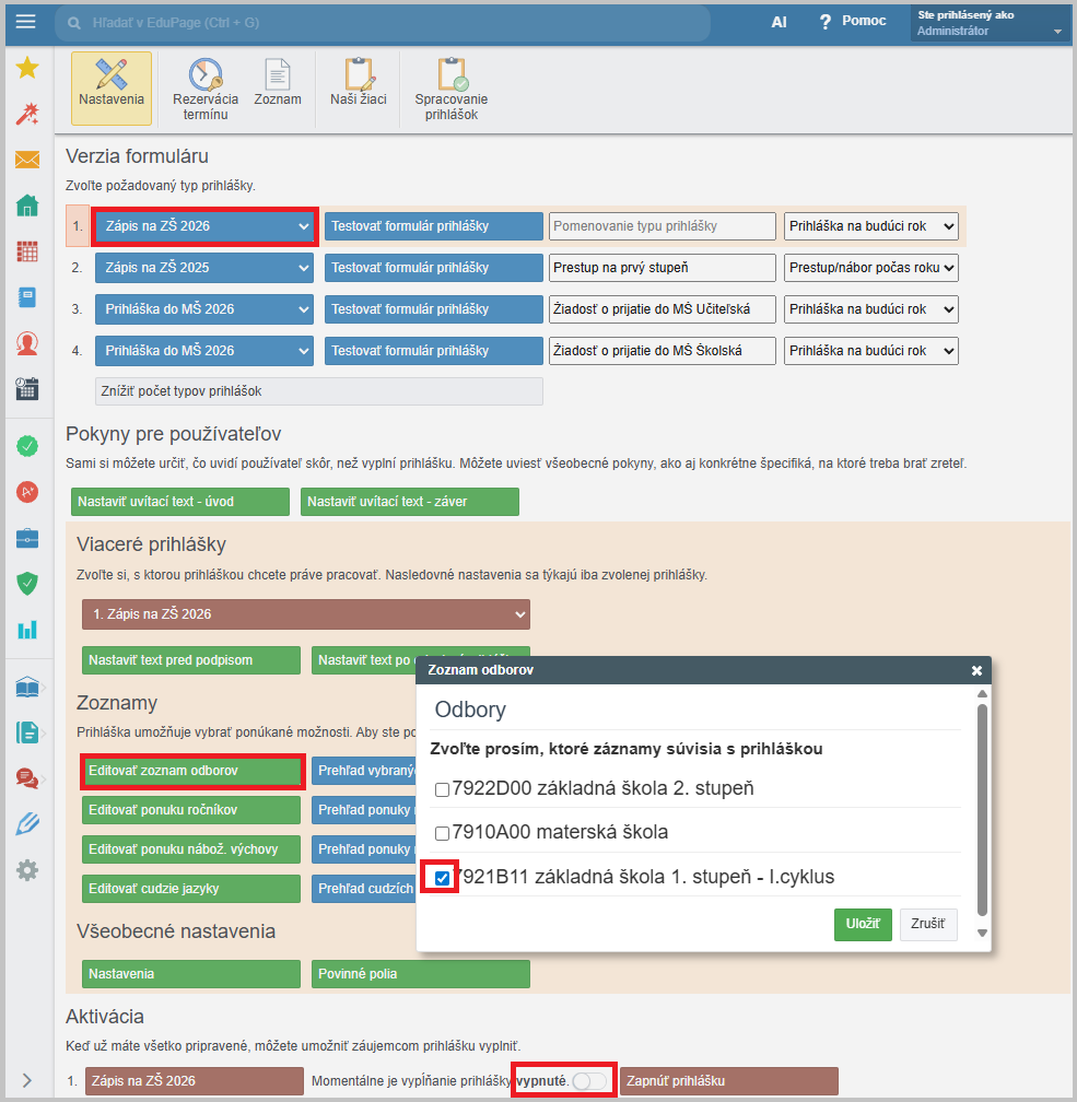 V el. prihláške v EduPage vytvorte formulár. Napríklad "Zápis na ZŠ". Zo zoznamu odborov vyberte 1. stupeň. Formulár nemusíte zverejňovať.