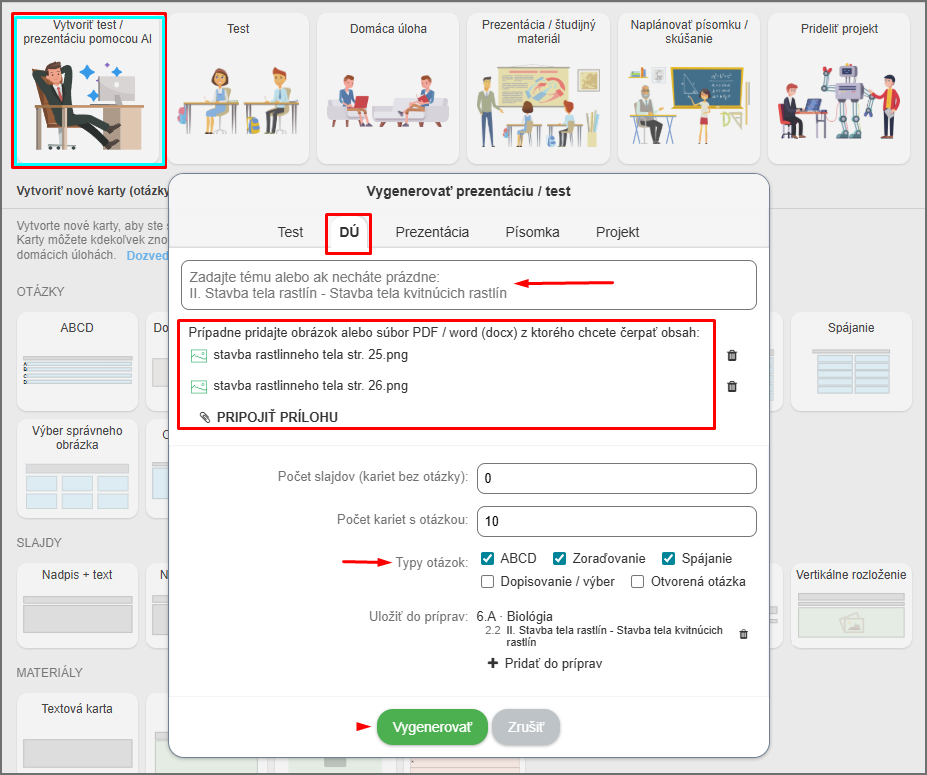 Zvoľte Vytvoriť test/prezentáciu pomocou AI zadajte tému alebo iba priložte fotografiu alebo sken materiálu, z ktorého ste učili a plánujete učiť.