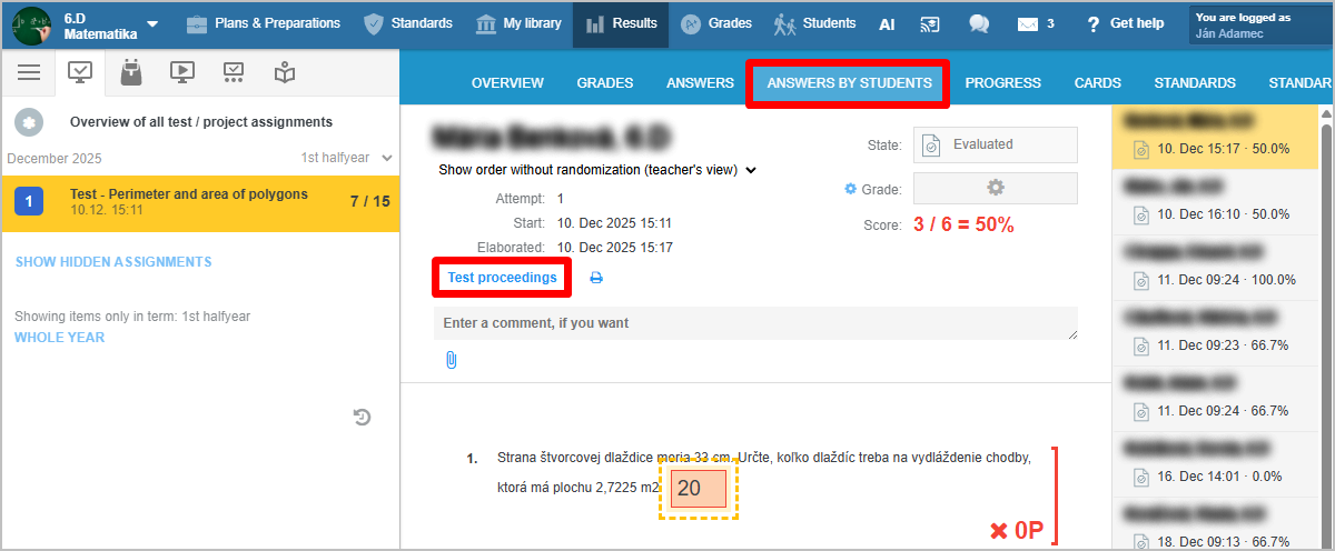 By clicking on a specific student, the student’s test appears on the right side of the screen, and the sequence of the student’s activities with timestamps appears on the left side.