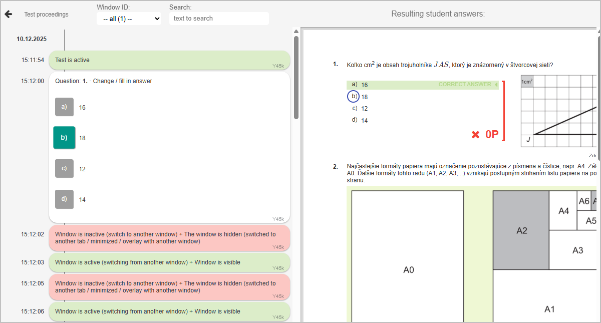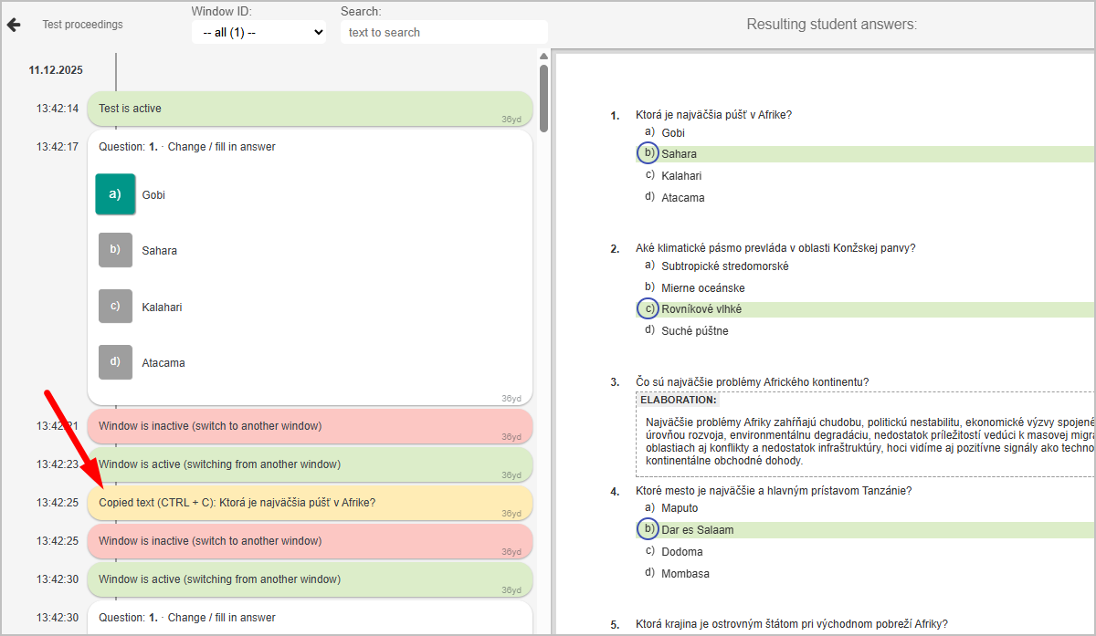 When a student copies text from the test, the teacher can see exactly what was copied. If a student copies an entire question, it likely indicates an attempt to cheat — i.e., solving the task using external help instead of their own thinking.