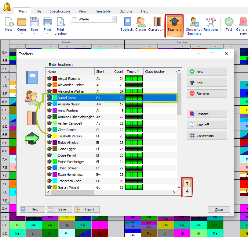 Just click on the item you wish to reposition in the list and use the up/down arrows to move it to the desired position. For classes, teachers, and classrooms, this will also change the order of timetable rows on the main screen in Whole/Teachers/Classrooms views.