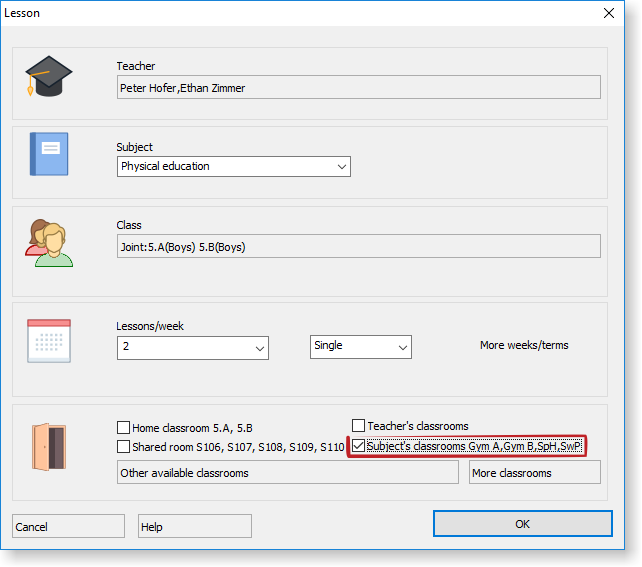 Once you specify this information all newly inputted lessons of this subject will be set to use the specified classrooms: