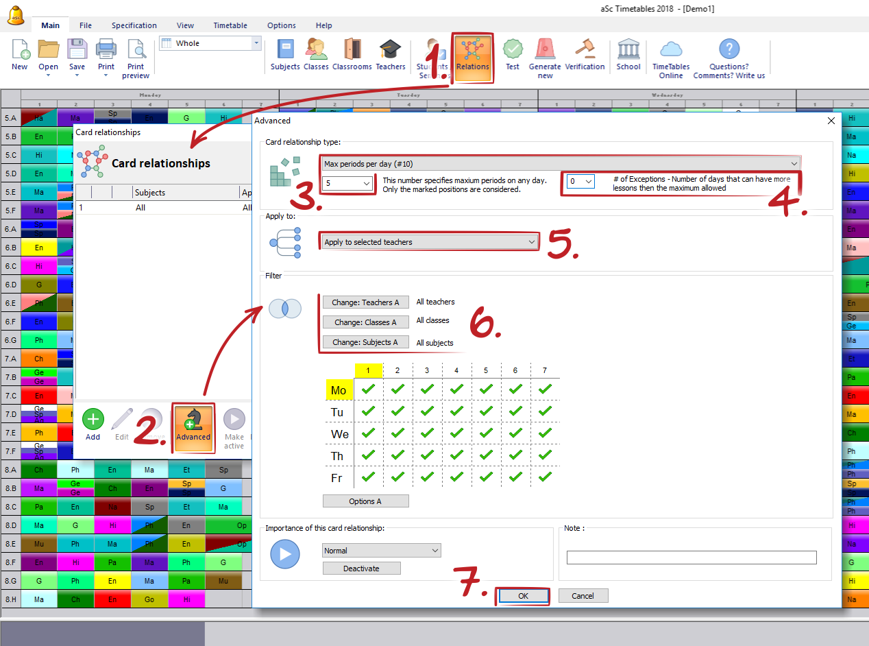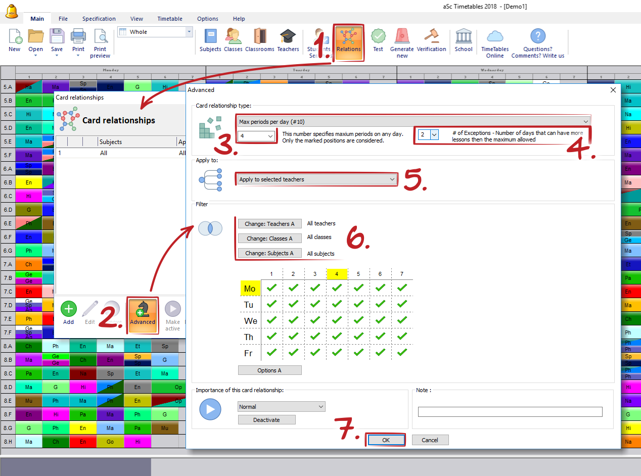 2. Now set that teacher can have max 4 periods per day with two exceptions. It will mean, that these two days teacher can teach max 5 periods, which were set in first step.