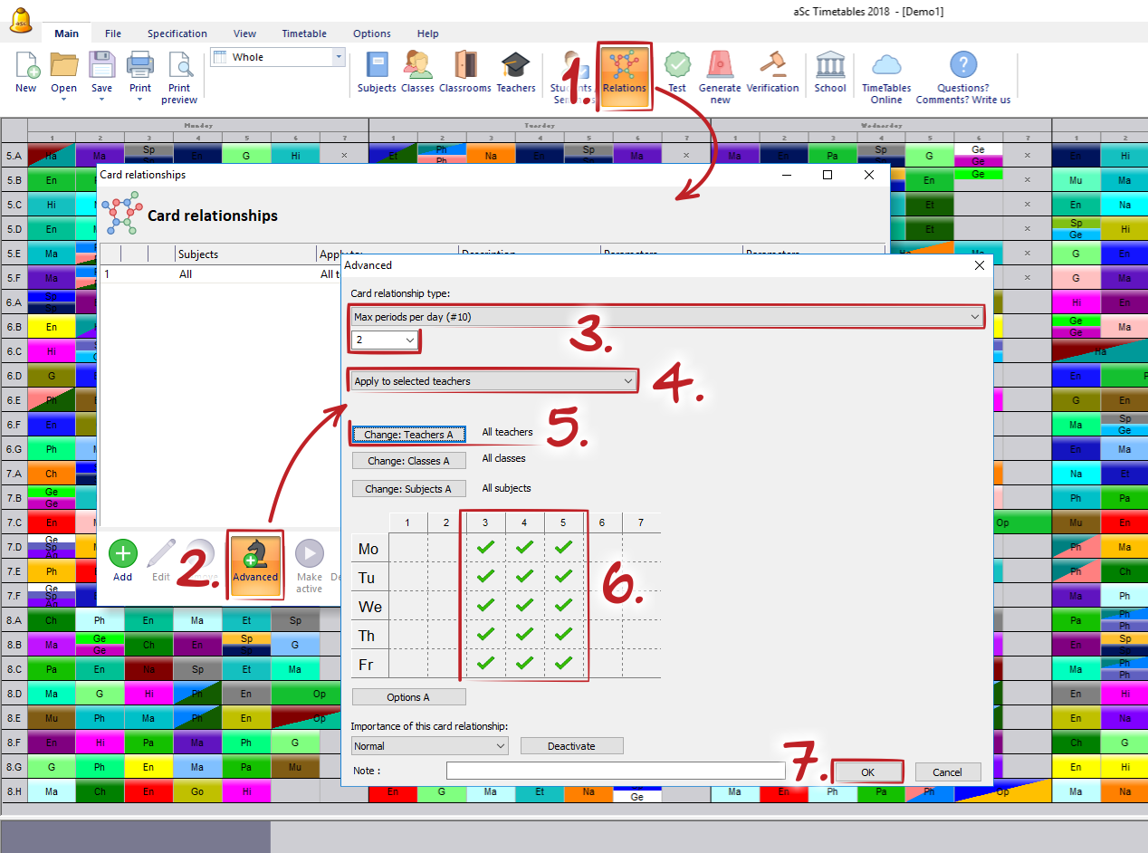 Example: Lunch between periods 3-5. This means there are 3 periods available. So we can input it making sure that during 3.-5. period teacher can have max 2 lessons.