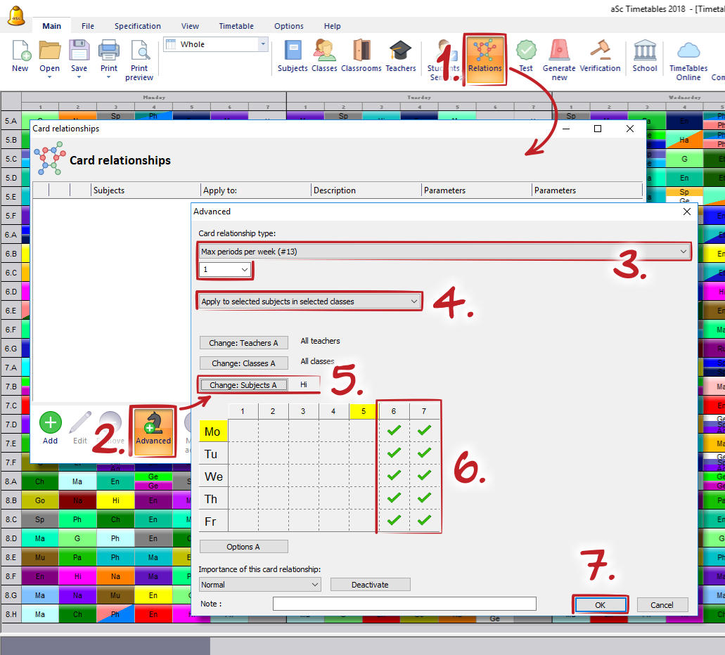 The software will then check max 1 period of History in each selected class. If you for example use Apply globally the software will allow only one history on 6th or 7th in the whole school.