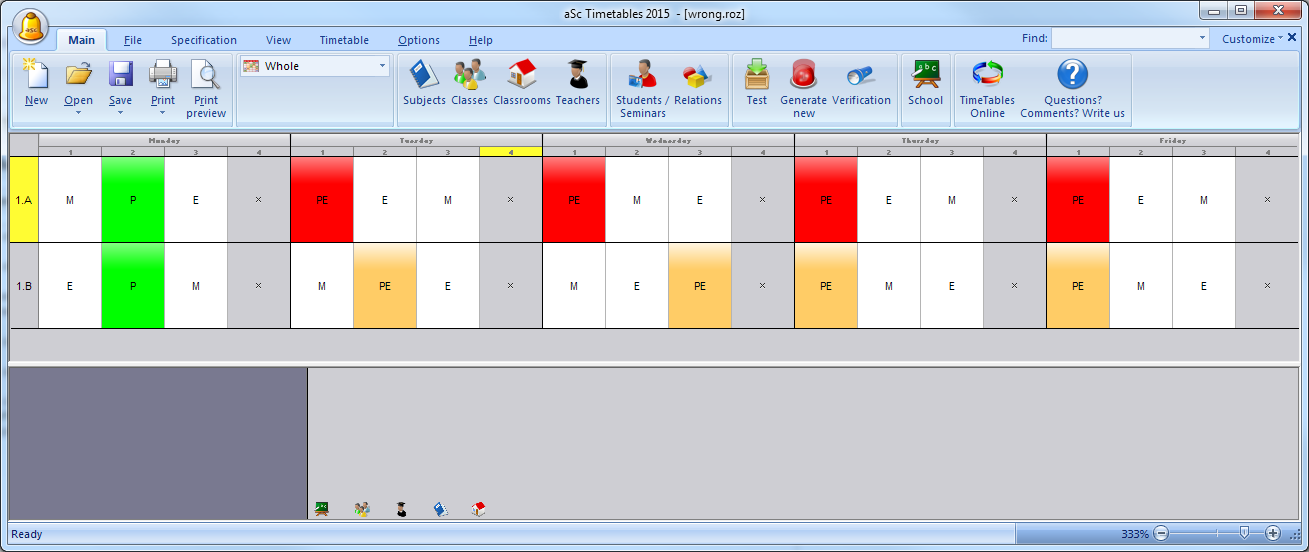 So to solve the above timetable, you will need to tell the software to accept that Math can be two times on the same day. If this is not acceptable at your school, you will need to convince the PE teachers to come on the same days. Or you might allow 4th periods.