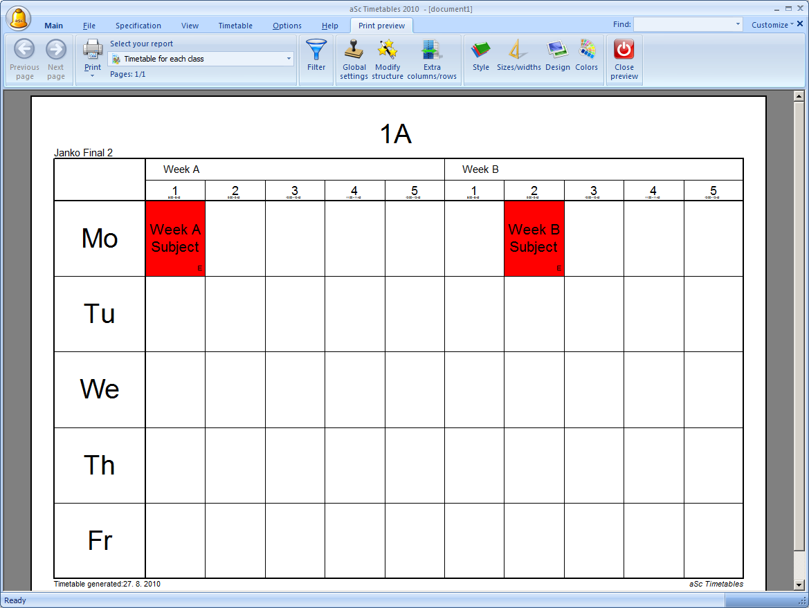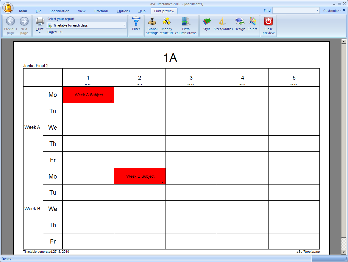 By default the software prints the two weeks (or two terms) timetable on one sheet, with the row divided into weeks (terms). Top part of the row shows week A, bottom part shows week B:
