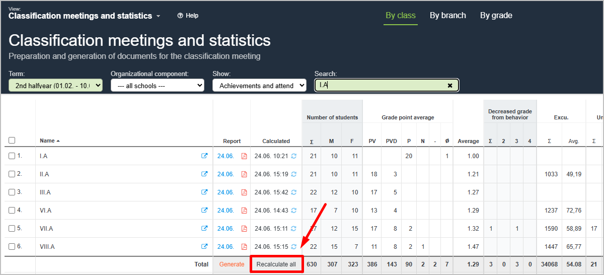 If you have already generated and saved the classification report (i.e., you see a PDF file in the Report column) and you later changed grade or attendance data, you must not only recalculate the statistics but also regenerate and save the classification report. Simply recalculating the data does not update the PDF classification report.
