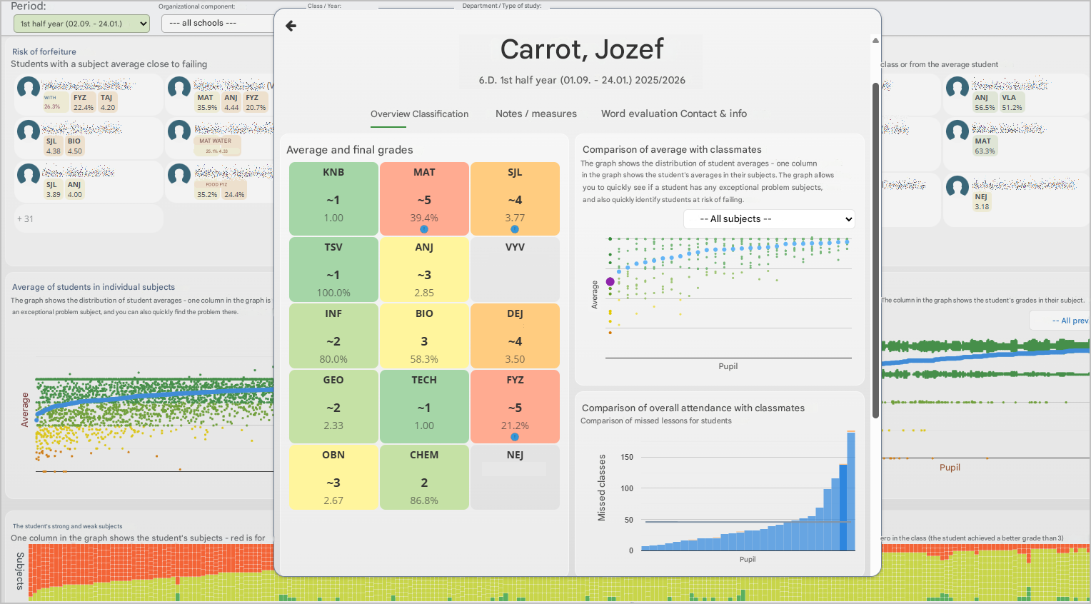 In each section, you can see a clear visual chart as well as a list of specific students — both those who are performing well and those who may be struggling in that particular area and might need support. You can click on any student in the list or directly in the chart to view a detailed overview of that student’s information for the current school year.