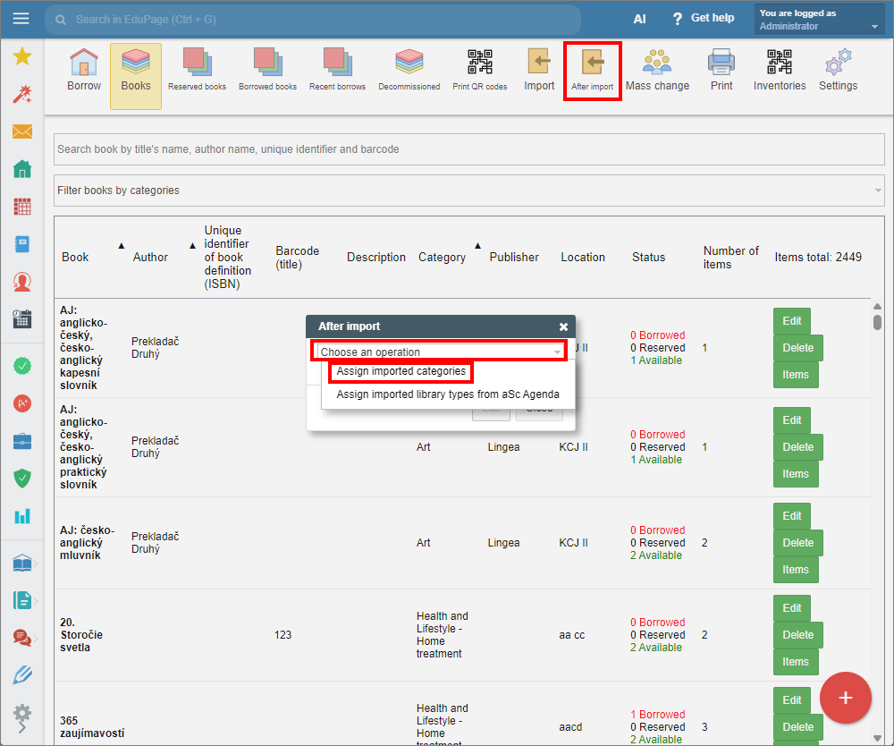 In the “Book” tab, you can view, add, edit, lend, decommission and delete titles and their items. To edit items, select the “Items” tab of the desired title.