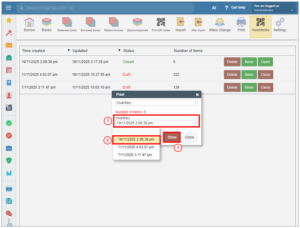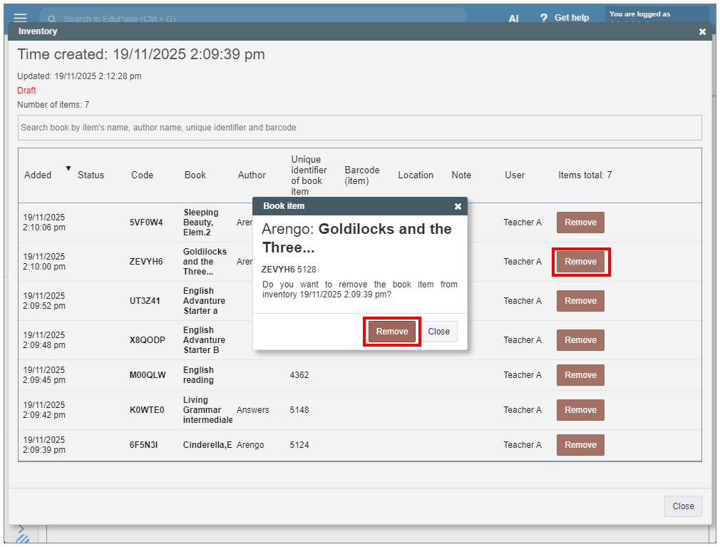 If the book item that has already been recorded in the list is later decommissioned or deleted, it will remain in the inventory record with information about its status.This information will be displayed even after the inventory record is closed.