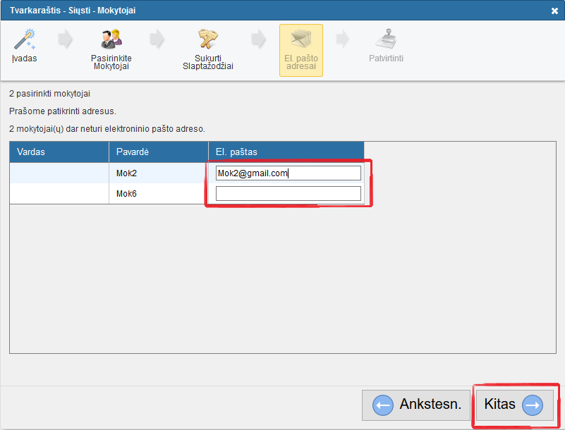 Trečiame žingsnyje galite redaguoti mokytojų el. pašto adresus: