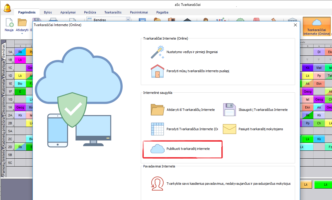 Galite publikuoti (paskelbti) tvarkaraštį modulyje "Tvarkaraščiai Internete" tiesiai iš Tvarkaraščių sudarymo programos.