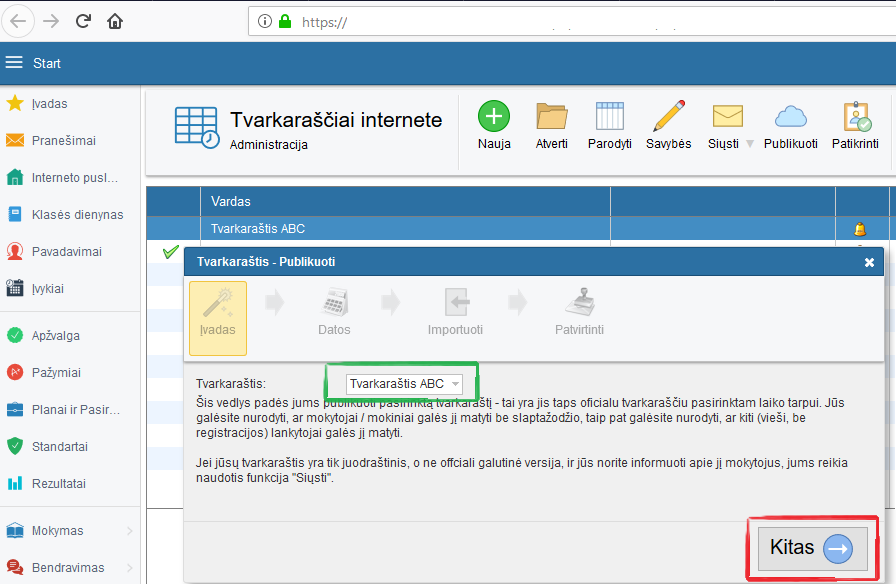 Kitu žingsniu galima importuoti visus duomenis iš tvarkaraščio į "Tvarkaraščius Internete".