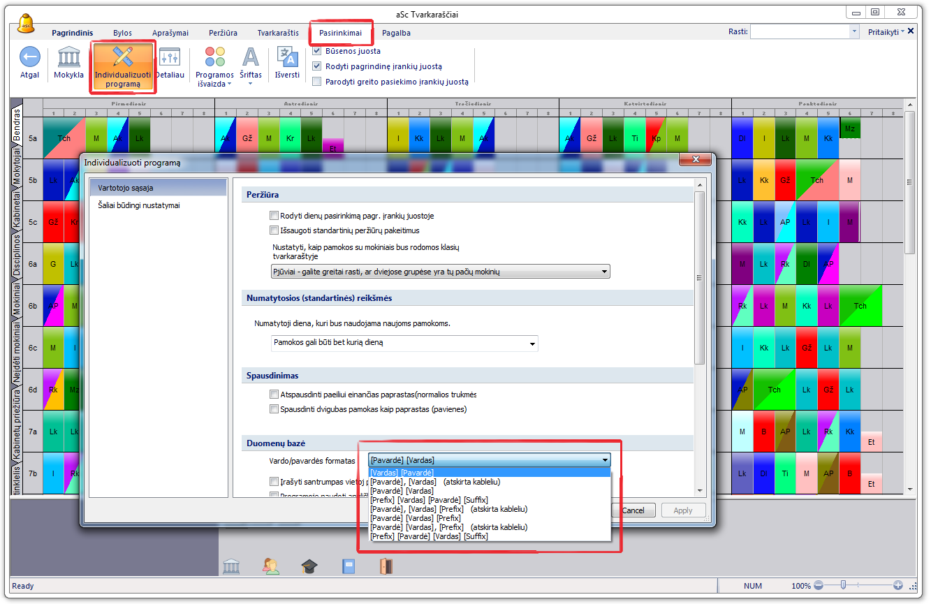 Tuomet reikia pasirinkti tinkamą vardo ir pavardės rodymo tvarką, tą galima padaryti, pasirinkus meniu punktus Pasirinkimai, Individualizuoti programą, Duomenų bazė, Vardo/Pavardės formatas.