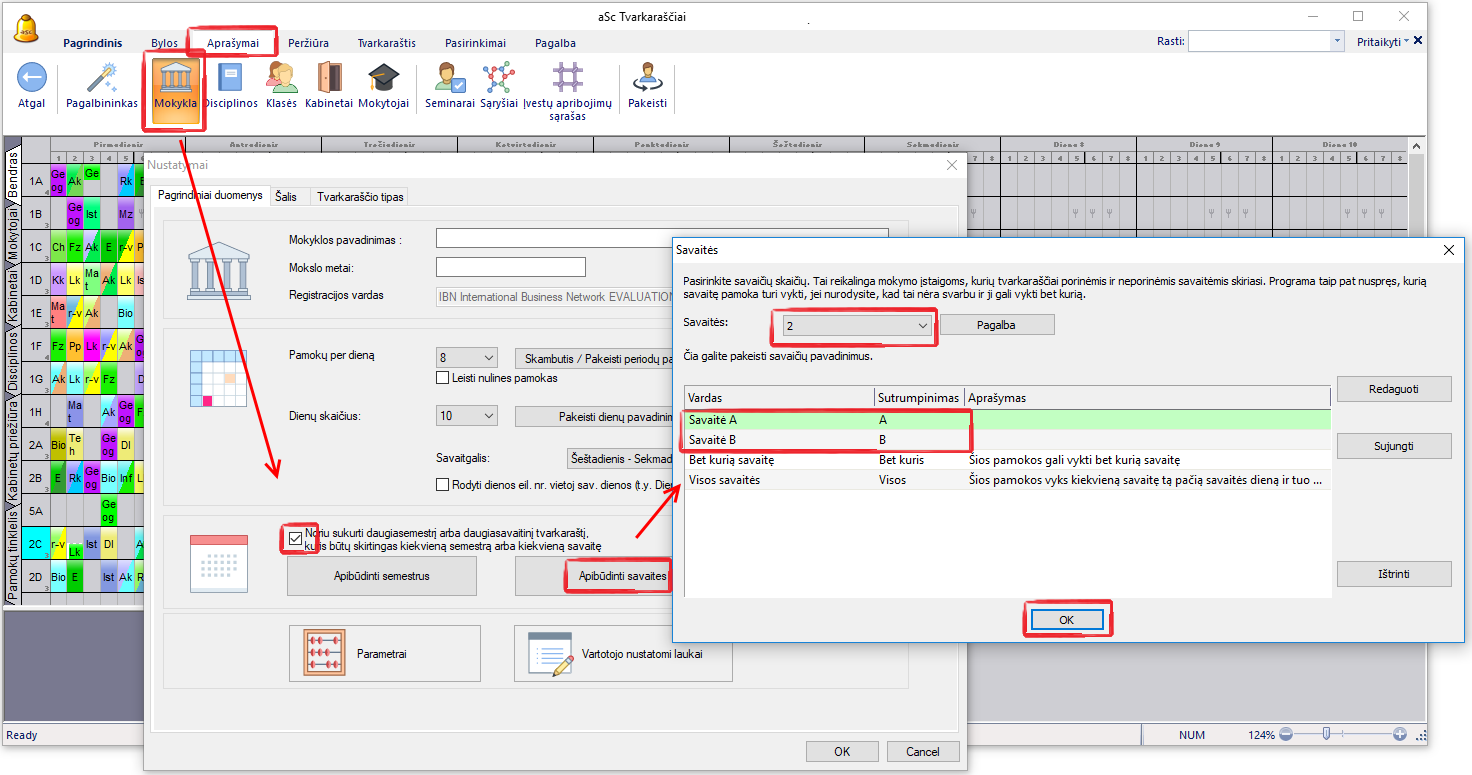 Reikia nurodyti, kad norite sukurti tvarkaraštį, kuriame skirtingomis savaitėmis tvarkaraščiai gali skirtis, galima įrašyti ir savaičių pavadinimus:
