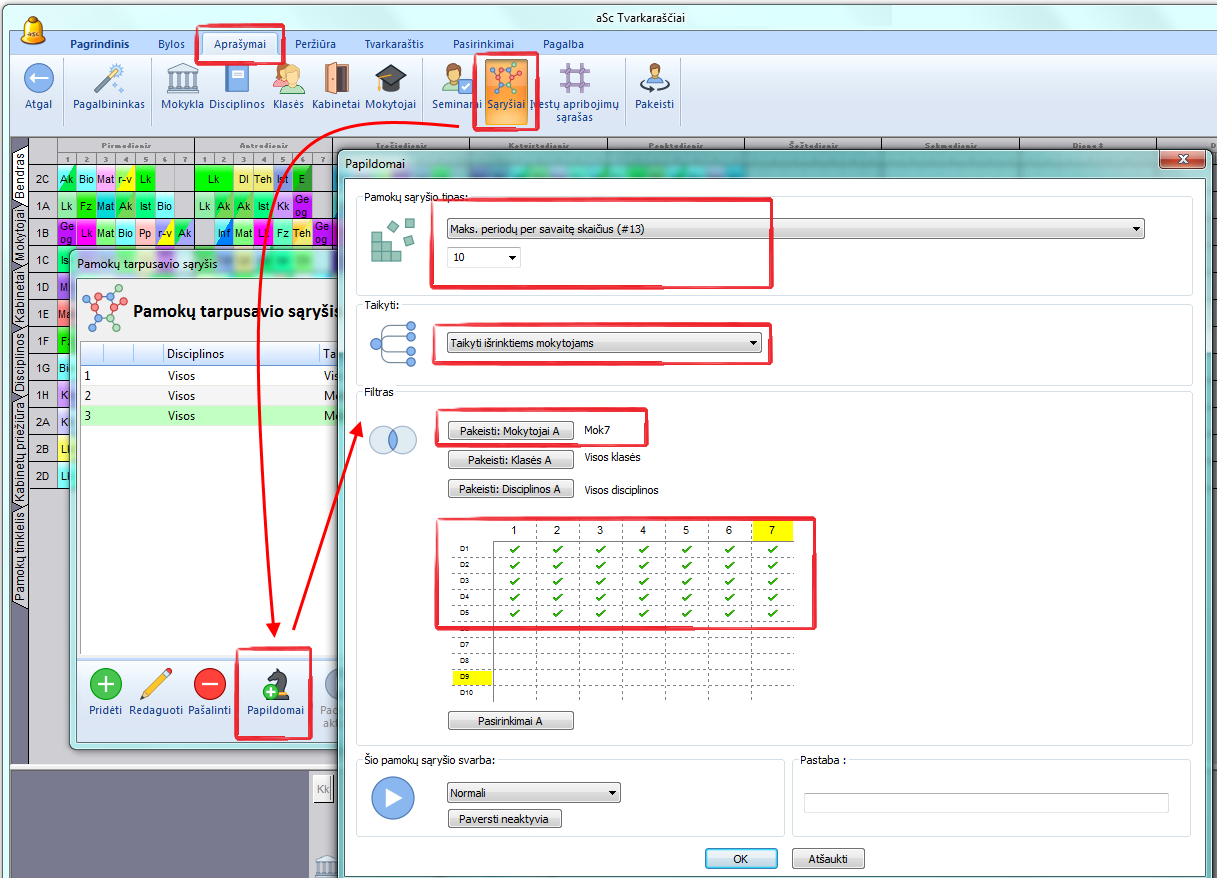 Norėdami to išvengti, turite įvesti tokį papildomą pamokų sąryšį, nurodantį maksimalų pamokų skaičių, kurį mokytojas turi turėti pirmąsias 5 dienas (pirmą savaitę):