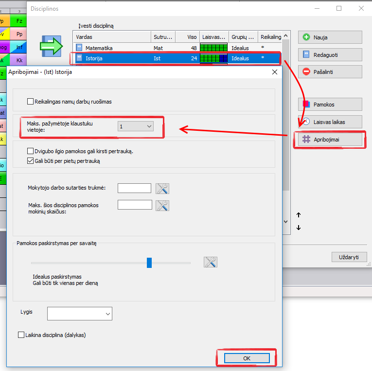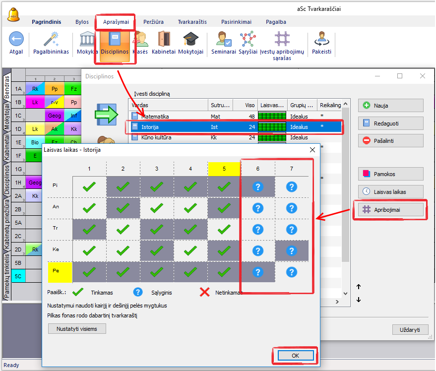 Kiekvienai disciplinai galima nurodyti, kiek kartų jos pamokos gali vykti pamokų pozicijose (vietose), pažymėtose klaustuku.
