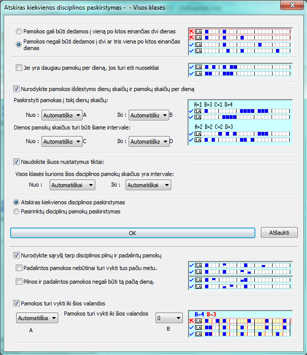 - "Pasirinktų disciplinų pamokų paskirstymas" gali būti naudojamas, pavyzdžiui, biologijos ir biologijos laboratorinių disciplinoms kartu - tada programa laikys jas viena disciplina (ir nedės, pavyzdžiui, tą pačią dieną).