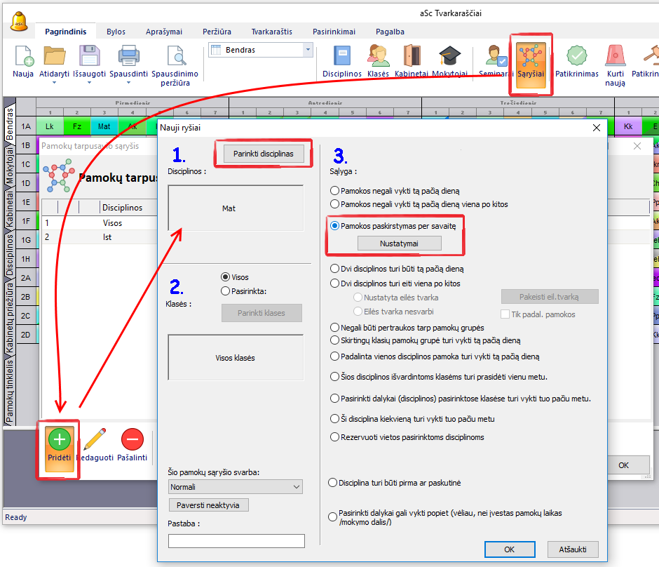 3. Jeigu yra 2 - 3 disciplinos pamokos per savaitę, jų nedės į vieną po kitos einančias dienas (šią salygą galima užduoti meniu komandomis "Tvarkaraštis, Parametrai").