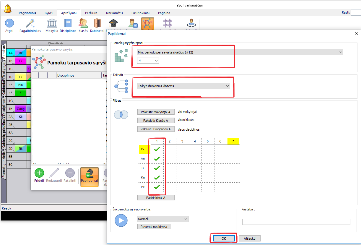2. Po to pamokų tarpusavio sąryšiu reikia apriboti, kiek kartų tai įvyks: čia nurodyta, kad klasė turi turėti bent keturias pirmas pamokas: