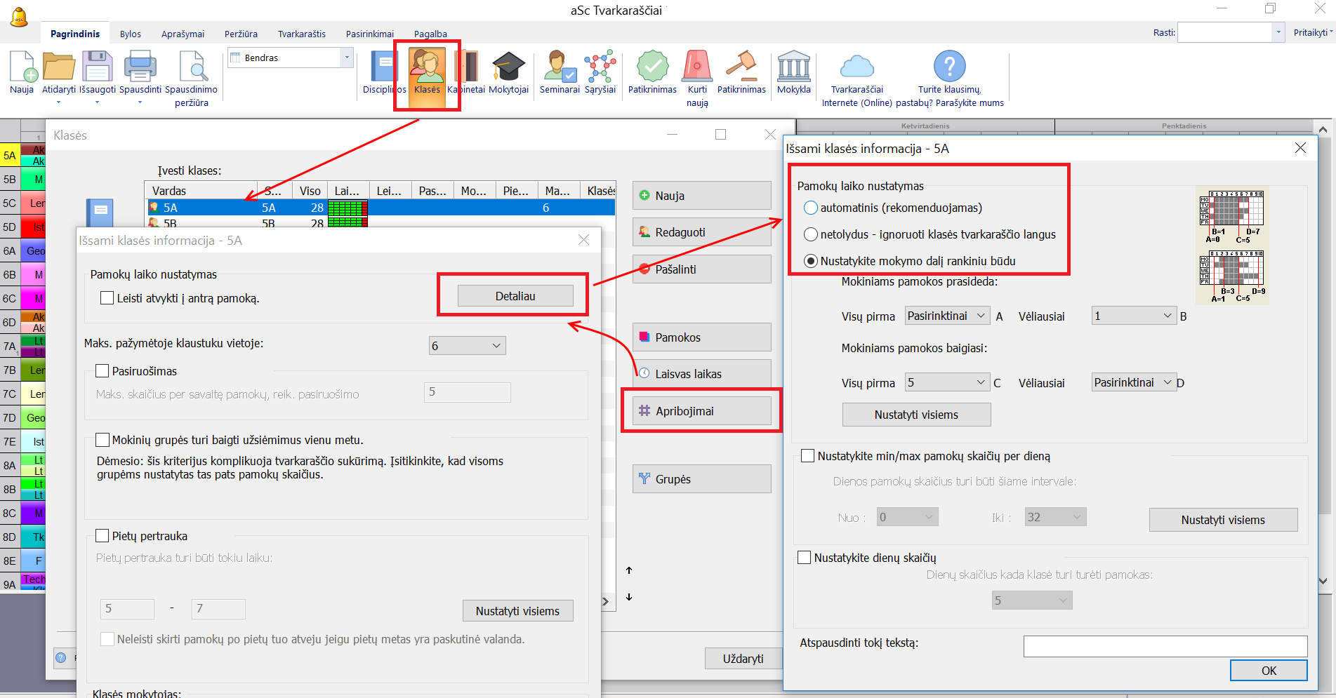 Skaičiai A ir D nustato, kada klasė gali turėti pamokas. Tą patį galite nustatyti ir klasės laisvo laiko lange. Galite palikti šiuos skaičius ir ties nustatymu "Pasirinktinai" - tuomet programa atsižvelgs tik į klasės laisvo laiko nustatymą.