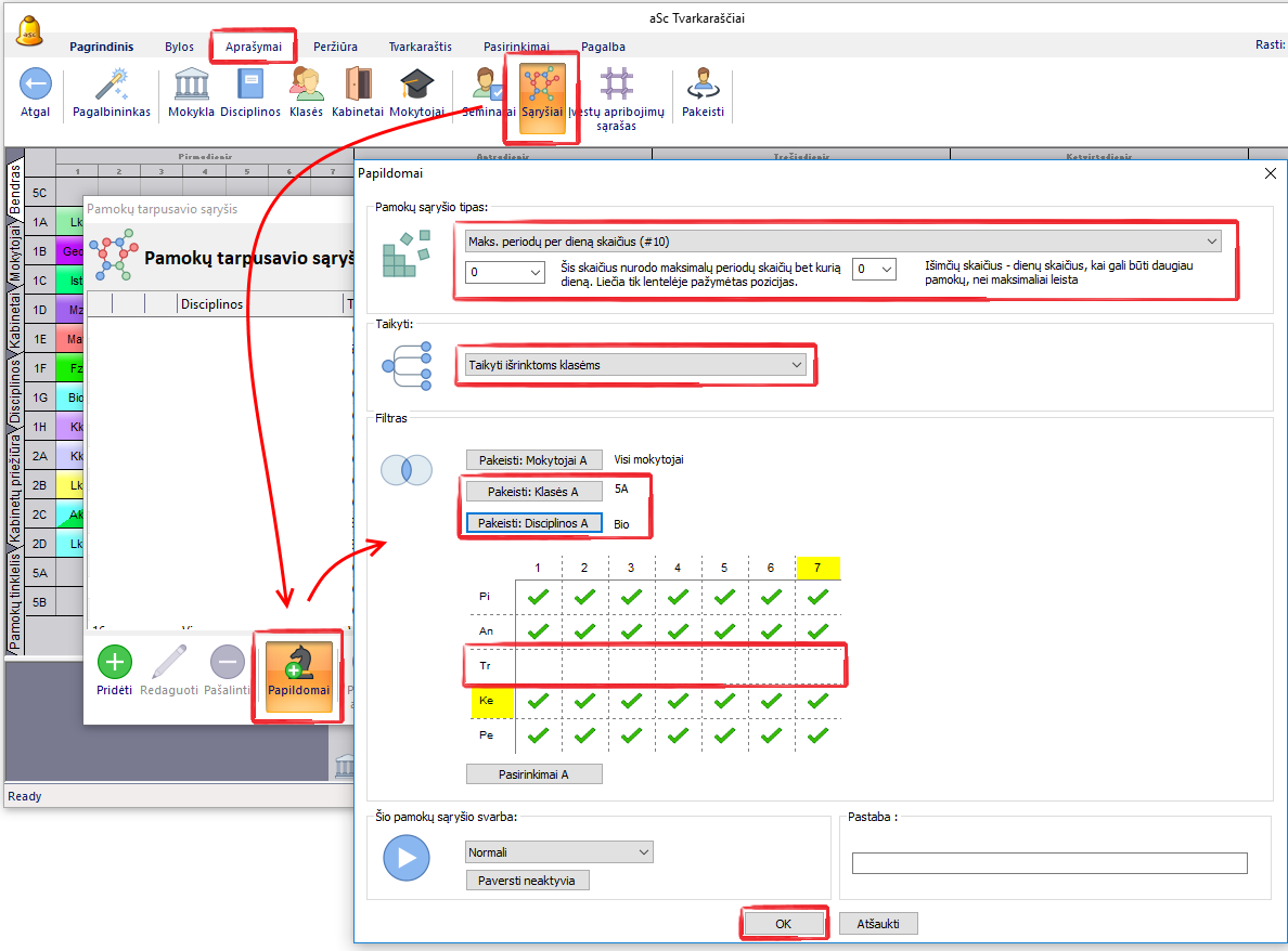 Čia nurodyta, kad norite, jog pažymėtomis dienomis būtų 0 biologijos pamokų periodų parinktai klasei. Taigi šiai klasei Biologija galės vykti tik trečiadieniais.