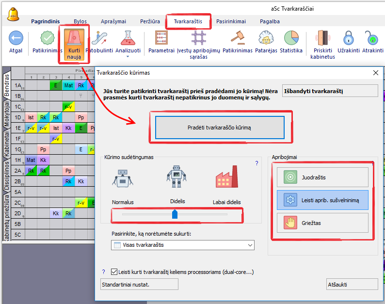 Po tvarkaraščio patikrinimo jo kūrimas yra gana paprastas – pasirinkus meniu punktus "Tvarkaraštis, Kurti naują" bus paleistas programos algoritmas, kuris pradės darbą. Programa pašalins iš tvarkaraščio visas pamokas, išskyrus užrakintas. Ji mėgins sukurti tokį tvarkaraštį, kuris atitinka visas užduotas sąlygas.
