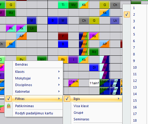 1. Spustelėkite dešinįjį pelės mygtuką neįdėtų pamokų juostoje, apačioje, ir pasirinkite "Filtras" bei reikiamas pamokas.