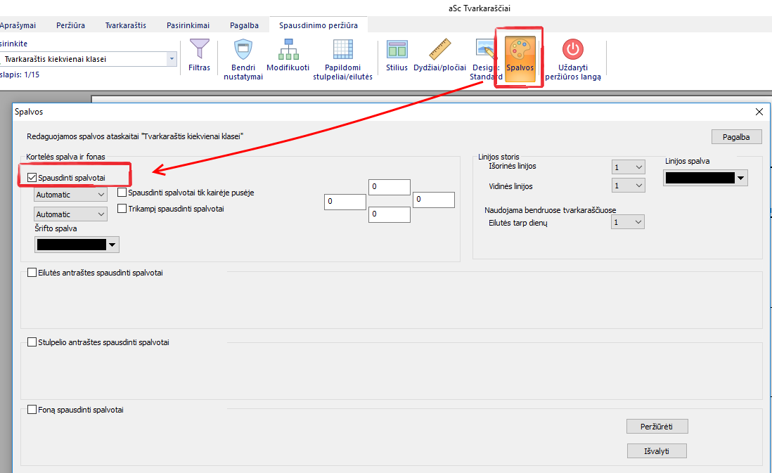 Paspauskite mygtuką "Spalvos". Atsidariusiame lange galėsite nurodyti, ar norite spausdinti spalvotai: