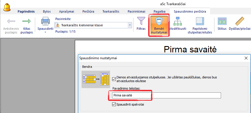 Spausdinimo peržiūros lange pasirinkite "Bendri nustatymai" ir įrašykite tekstą: