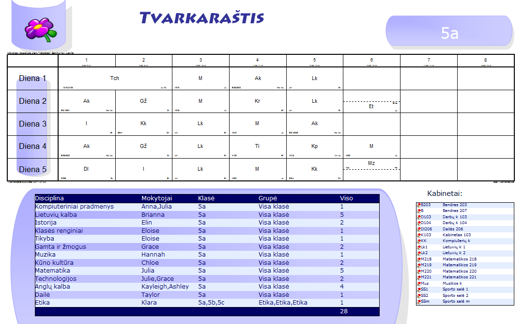Spausdinimo peržiūros lange pasirinkite norimą klasę, mokytoją ar kabinetą, kuriems norėtumėte pakeisti dizainą.