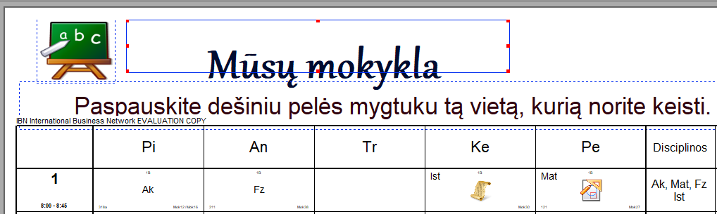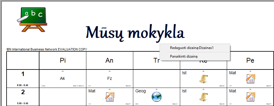 - dizainai nėra išsaugomi kartu su tvarkaraščio byla. Jeigu norite, ka jį būtų galima atspausdinti iš kito kompiuterio (kuriame turi būti tvarkaraščių programa), nukopijuokite direktoriją "c:\timetables\designs\Kietas dizainas su logotipu" į šį kompiuterį prieš spausdinant.