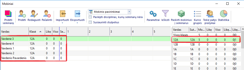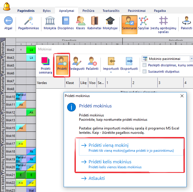 Po to, Seminarų lange paspaudę "Pridėti", galite įvesti mokinių vardus: