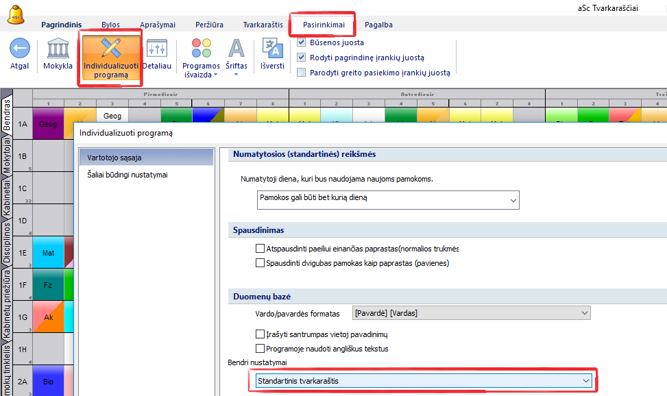 Tvarkaraštis, pagrįstas mokinių pasirinkimais (Klasės/Lygiai) - kiekvieną klasę (klasės lygį) parodo vienoje eilutėje. Ši parinktis naudoja tvarkaraščių sudarymo generatorių, kuris leidžia perkelti mokinius į kitas grupes tvarkaraščio sudarymo metu.