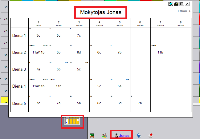 Išsirinkus antrą - penktą skirtukus, atsiras langelis viduryje (mažo tvarkaraščio formos), leidžiantis pasižiūrėti pasirinkto mokytojo, kabineto, disciplinos ar klasės tvarkaraštį. Jį paspaudus, atsivers atitinkamas tvarkaraštis: