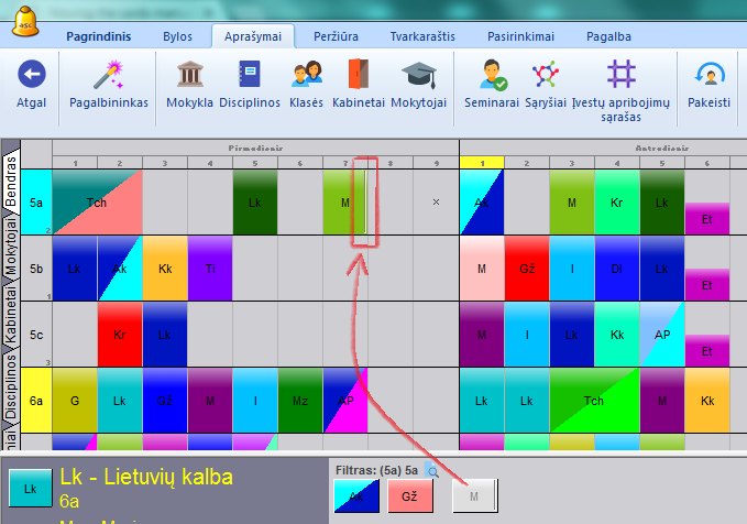 Klasės, kuriai priklauso ta pamoka, eilutės pavadinimas nusidažys žaliai. Programa neleis padėti pamokos į ne šios klasės eilutę.