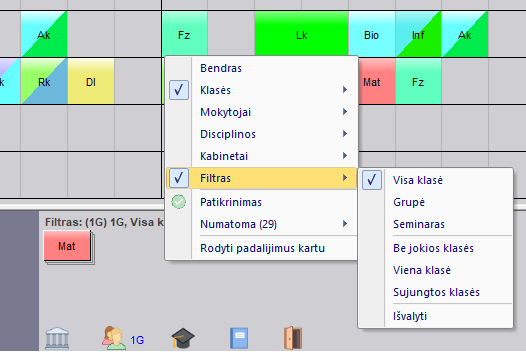 Paspauskite dešiniu pelės mygtuku nepatalpintų pamokų srityje - atsiras meniu, kuriame galėsite pasirinkti įvairius filtrus, pavyzdžiui, kad būtų rodomos tik matematikos pamokos, tik vienas kuris kabinetas, ar pamokos, kurios yra tik visai klasei ir pan.: