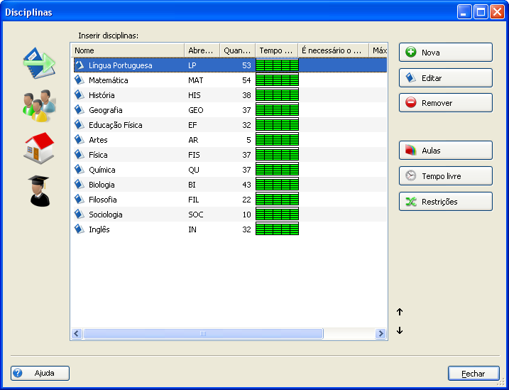 Nesta etapa você insere as disciplinas que serão ensinadas este ano na escola: