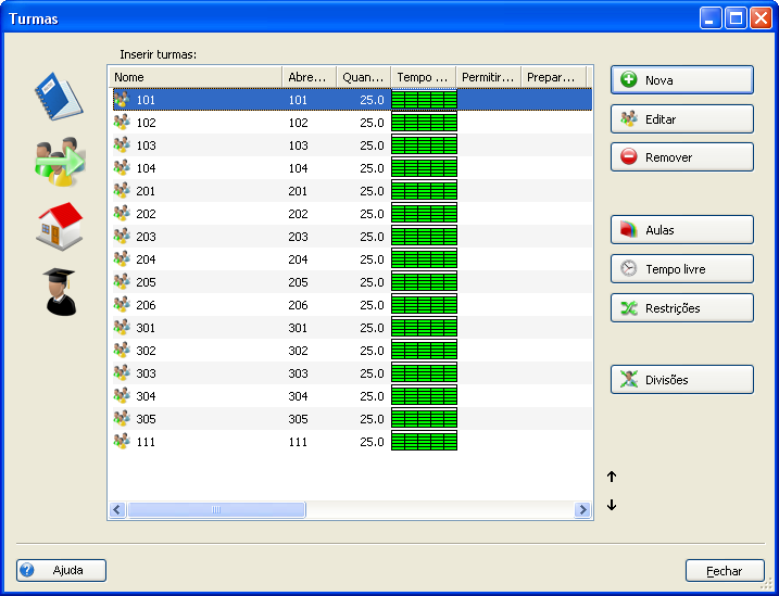 Similar ao passo anterior, aqui você pode criar, editar, ou excluir uma turma. Você pode inserir outros dados para uma turma: Aulas..., Divisões... and Tempo livre.