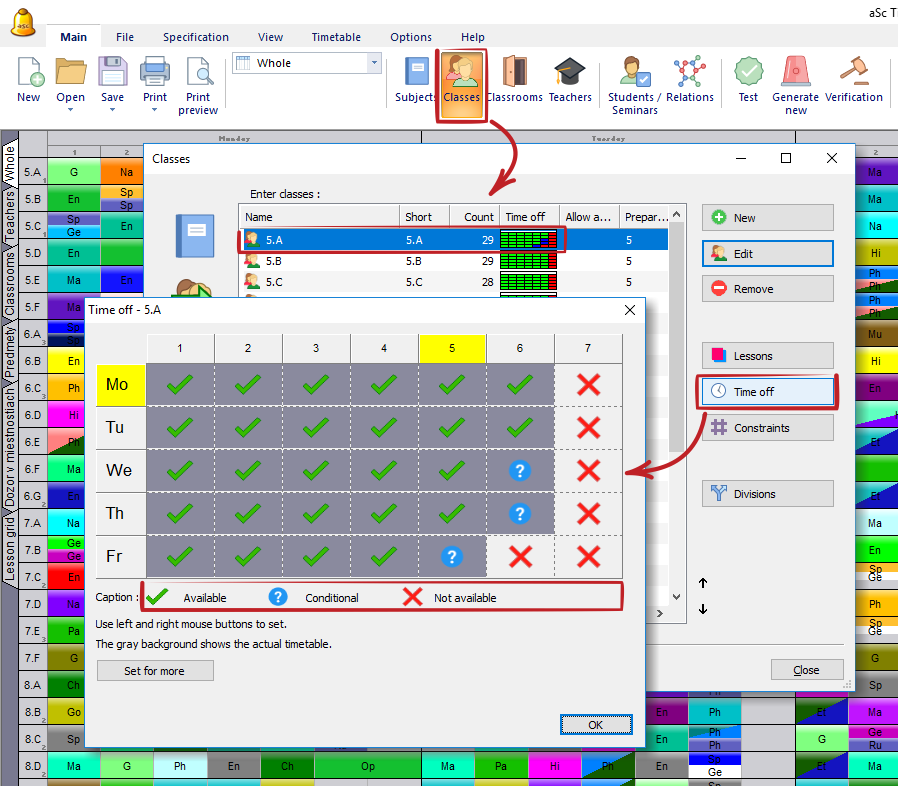 Klikanjem na „isključeno“ možete podesiti kada pojedini razred može i kada ne može imati sate. Npr, ako 8.a posjećuju svetu misu svake srijede ujutro, ili djeca moraju stajati svakog petka popodne na počasnoj straži monumenta poznatog nacionalnog pisca, možete u raporedu sati, za to vrijeme, isključiti predavanja.