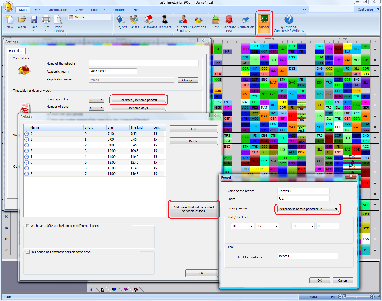 If you have longer breaks that shall be indicated in the timetable printouts, you can add them using button add breaks: