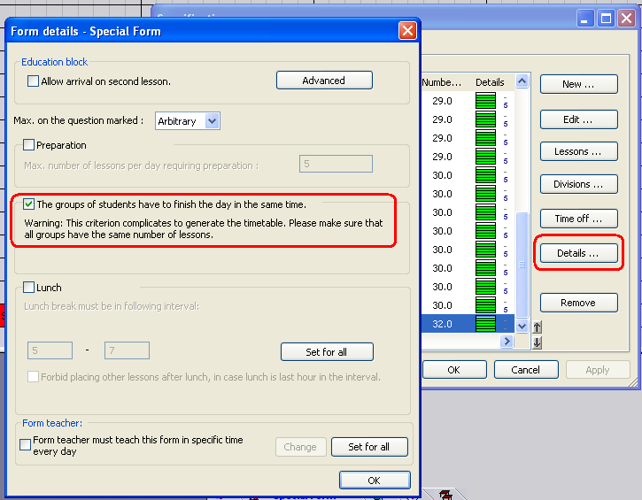 במקרה זה ניתן למנוע מצב זה על ידי סימון,בחלון ההגבלות של הכיתה כי "קבוצות התלמידים צריכות לסיים את יום הלימודים באותה השעה":