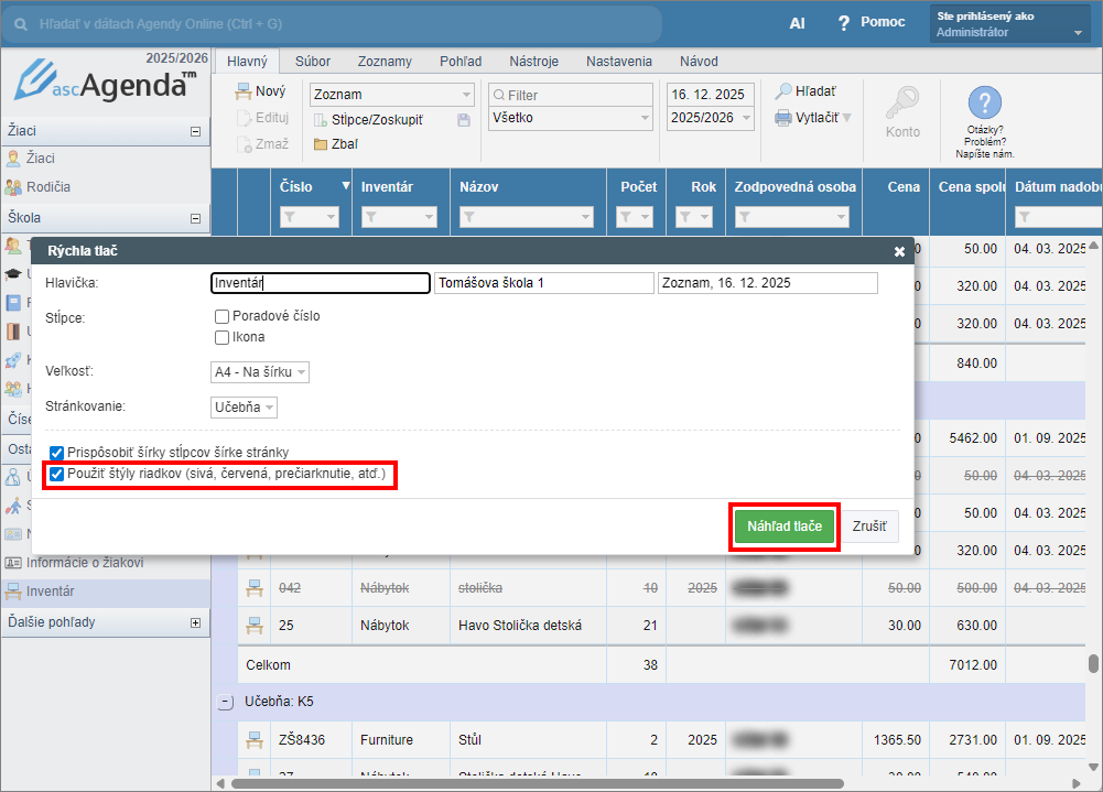 Vyberte "Rýchla tlač". V zobrazenom okne, deaktivovaním možnosti "Použiť štýly riadkov", môžete pre účel tlače, zrušiť prečiarknutie a sivú farbu textu vyradených položiek.