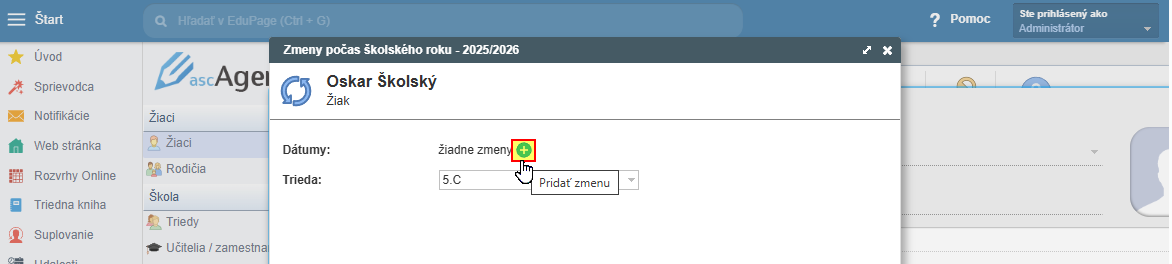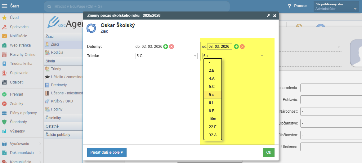 V našom príklade žiak Oskar prestupuje z 5.C triedy do 5.X triedy.