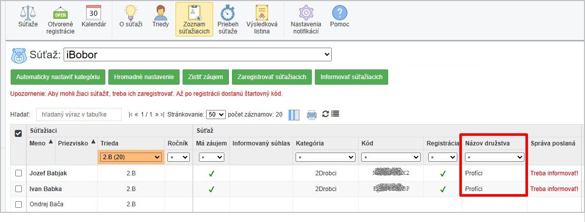 Pri registrácii má každý súťažiaci z dvojice vygenerovaný súťažný kód. Každý člen teamu má svoj vlastný / iný kód.