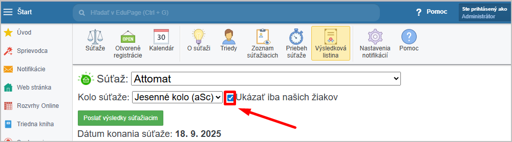 Ak si želáte zobraziť len umiestnenie žiakov vašej školy, zaškrtnite "Ukázať iba našich žiakov":